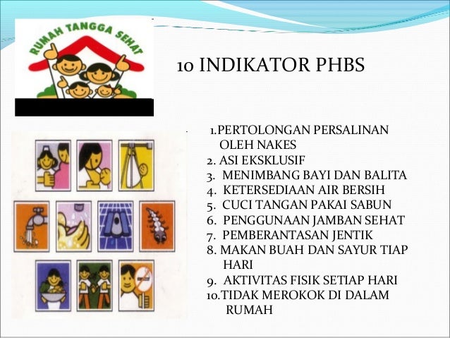 POWER POINT PHBS Download POWER POINT PHBS Faridah Rokhmah Melakukan Aktivitas Fisik Setiap Hari Tidak Merokok di Dalam Rumah 1 Bahan bangunan 2 Ventilasi 3 Cahaya 4 Luas bangunan rumah 5 Fasilitas fasilitas dalam rumah sehat 1 Pertolongan Persalinan oleh Tenaga Kesehatan 2 Bayi diberi ASI Sejak Lahir sampai berusia 6 bulan 3 Timbang balita 4 Rumah bebas jentik nyamuk 5 Cuci